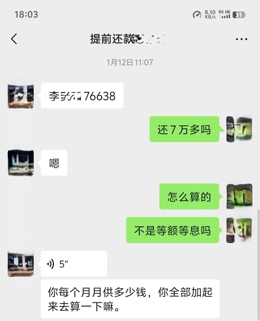 东莞市民李女士提供的聊天记录显示,在已经支付了17期租金的情况下,她留购车辆仍需支付76638元。