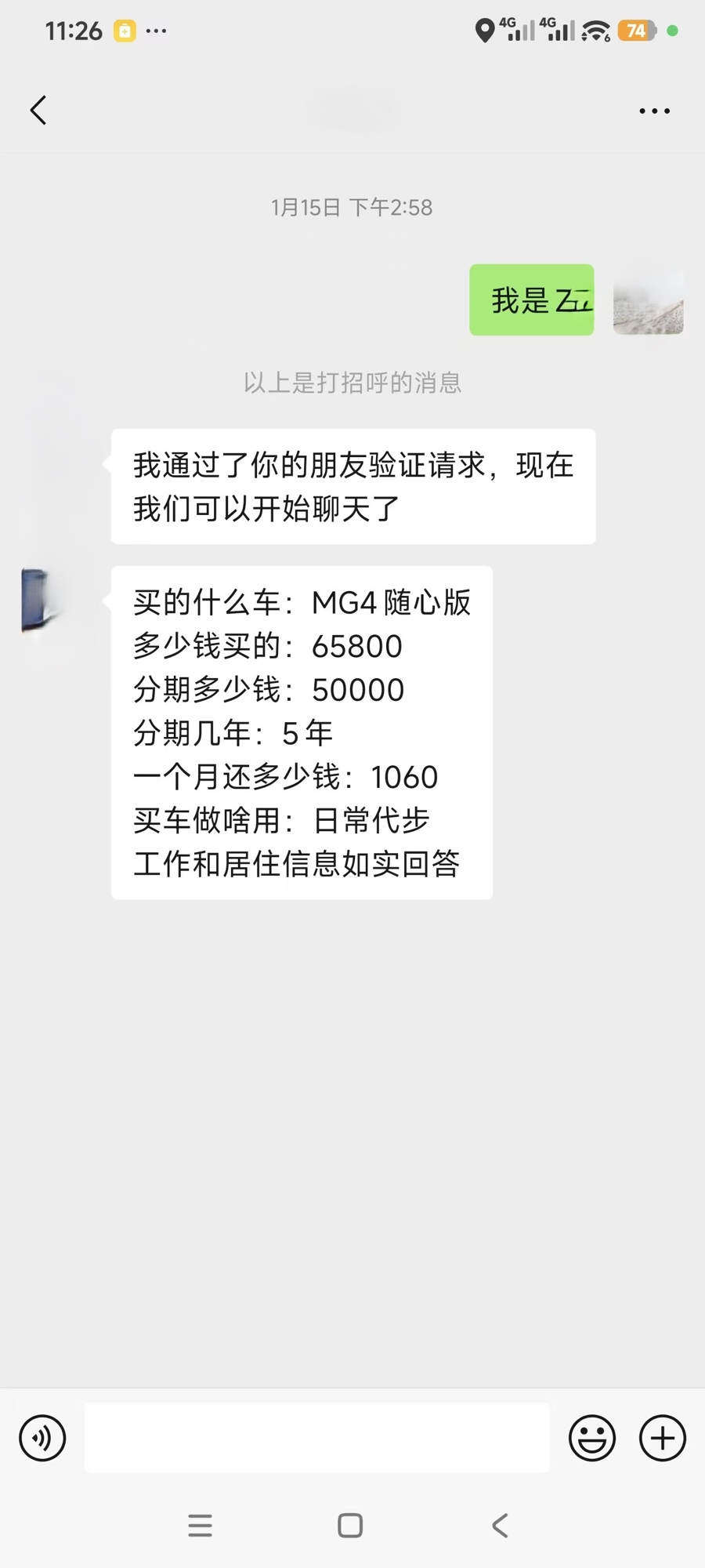 1月15日下午,在为了购车组建的微信群里,何女士被要求在线签约办理贷款。聊天记录显示,销售人员在群内贴了“东正汽车金融”小程序的二维码,要求何女士扫码填写个人信息和5万元的分期信息,操作征信授权,并称系统会评估匹配利息。何女士随后被告知系统显示她月还款是1062元,虽然比之前介绍的方案利息高了些,但考虑到仍在可承受范围内,她表示接受。此后,她被要求在手机上电子签名以签署分期合同,“合同条款密密麻麻,在手机上字非常小,我没怎么细看就签了”,何女士称。当天傍晚,她又赶到大川公路2569号名爵4S店,手持身份证补拍了照片,购买了保险,最终顺利提走了车辆。