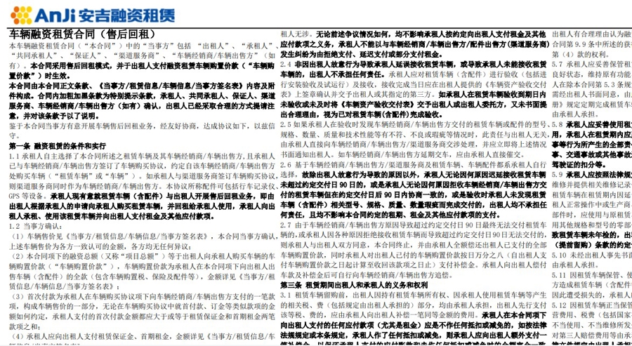 明明是买车,怎么变成租车了?何女士赶快讨来了她在手机上签订的电子合同,仔细一看才发觉,她签订的正是车辆融资租赁合同。与上述《办法》所称的定义略有不同的是,何女士所参与的,是融资租赁中的“售后回租”模式。根据合同的描述,何女士买车后,又以抵押的形式,将车辆卖给“安吉租赁”,“安吉租赁”再回租给何女士使用,以实现何女士的融资需求。