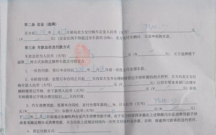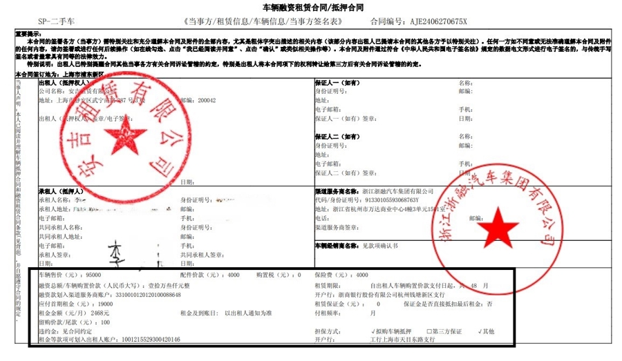东莞市民李女士日前也向解放日报·上观新闻反映,称她2024年6月在东莞“懂车乐”二手车商处购入一款吉利星瑞二手车,购车合同中约定车价88000元,首付7500元,剩余的则办理汽车消费贷款。合同签订后,“懂车乐”将她转给“浙融汽车集团”办理车贷,此后一直每月还款2480元,总计已还款17期。直至最近她想换车,才得知车辆竟被抵押了。
