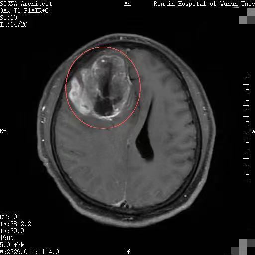 一个月前,湖北黄石市民李先生因持续半个月出现全身乏力、精神萎靡等症状,来到武汉大学人民医院东院区就诊。入住风湿免疫科后,颅脑核磁共振检查显示,其右侧额叶有一巨大占位,高度怀疑为恶性肿瘤。