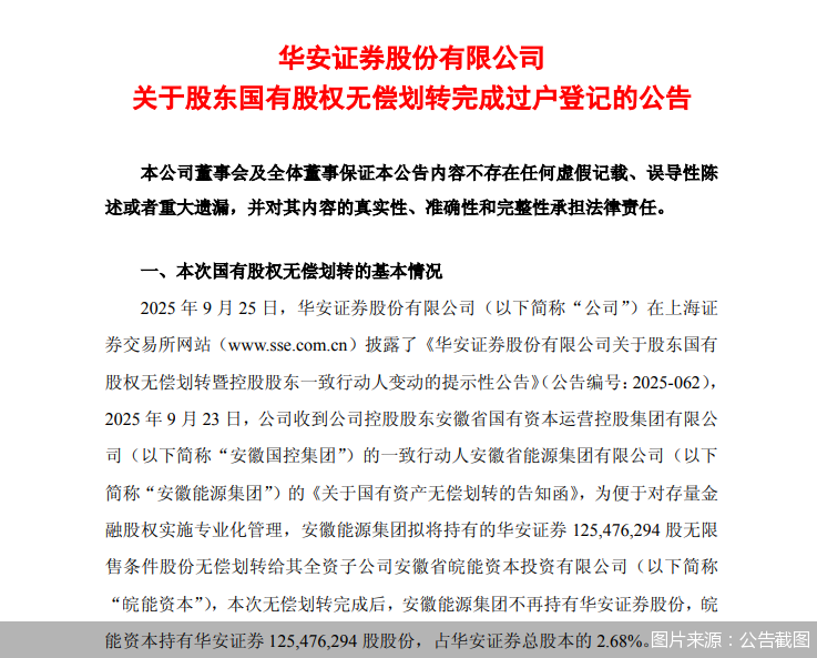 北京商报讯(记者 李海媛)10月27日,华安证券发布关于股东国有股权无偿划转完成过户登记的公告表示,近日,公司收到安徽省能源集团有限公司(以下简称“安徽能源集团”)《关于华安证券股份无偿划转完成的告知函》及《中国证券登记结算有限责任公司证券过户登记确认书》,获悉国有股权无偿划转至安徽省皖能资本投资有限公司(以下简称“皖能资本”)已完成过户登记手续,过户日期为2025年10月23日,过户数量为1.25亿股,股份性质为无限售流通股。