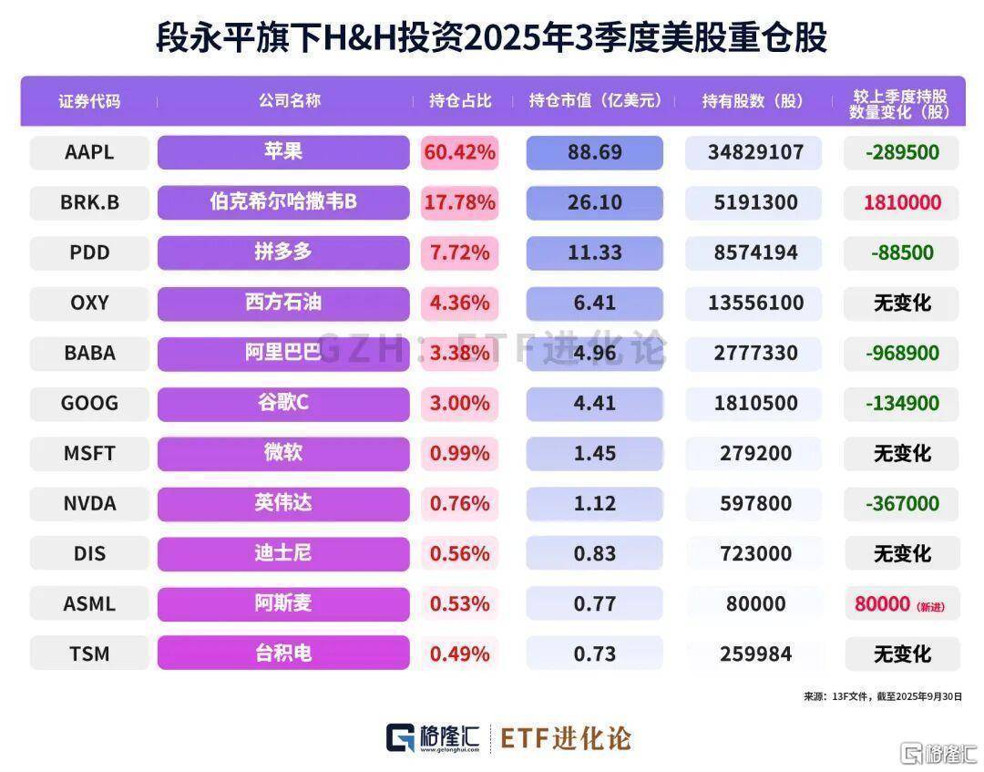 截至2025年三季度末,段永平管理的H&H持仓股11只,分别为苹果、伯克希尔B、拼多多、西方石油、阿里巴巴、谷歌C、微软、英伟达、迪士尼、阿斯麦和台积电。